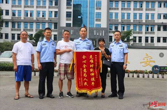 27日,田先生和家人特意到交警大队,为救了自己和弟弟两个家庭的交警送上锦旗,表达谢意。 红星新闻记者 于遵素 受访者供图