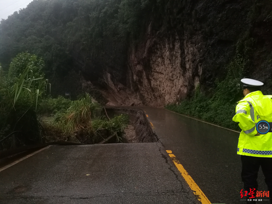 崇州市交警大队怀远分队分队长马学全告诉红星新闻记者,20日凌晨,他带着辅警余建、毛俊杰、鲁川在怀远青峰岭值班,凌晨4点50分左右,接到群众报警,鹞子岩处公路路基垮塌,“距离我们执勤点150米。”马学全说,当时发现,临水路基已经被暴雨造成的山洪冲刷出了4米左右的缺口,很可能会继续垮塌,就在这一危急时刻,他们突然发现,有车辆沿着鸡冠山公路下山方向朝垮塌路段过来,危险!马学全果断指挥,余建、鲁川冒着路基垮塌的危险,朝前方车辆狂奔过去,紧急把车拦下!就在车辆停下不久,余建、鲁川背后的路基就发生了再次垮塌,长达30米的半幅路基全部垮落! 田先生告诉红星新闻记者,当晚,已经下了整整一夜的暴雨,恰在这个时候,兄弟媳妇即将生产,必须立即送往崇州的医院。“我们在山上住了几十年,晓得这种情况路上可能不安全。”田先生说,天很黑,暴雨加上闪电,开车的视线很不好,他小心地开着车从文井江镇下山,刚到青峰岭鹞子岩附近,突然看到前面有几柱电筒光朝自己的车晃,有人朝自己跑过来,还有模糊又焦急的声音喊着“站到!站到!” 刚开始,田先生以为是路人有什么事想要搭车,开近了才看到是两个警察,已经冲到了自己的车前,田先生这才发现,就在车前五六米处,路基已经出现了垮塌。田先生当时就吓出了一身汗,“如果不是他们过来拦到,我在车上看不到(垮塌),肯定就掉进去了。” 此时,山上滚了几块石头下来。担心发生塌方,交警赶紧指挥田先生掉头返回。“我当时踩油门的脚都是软的,在发抖。”田先生说。车刚刚倒出去五六米,交警身后一声巨响,回头发现,临水的半幅公路已经垮塌了30多米长的缺口。 交警执勤