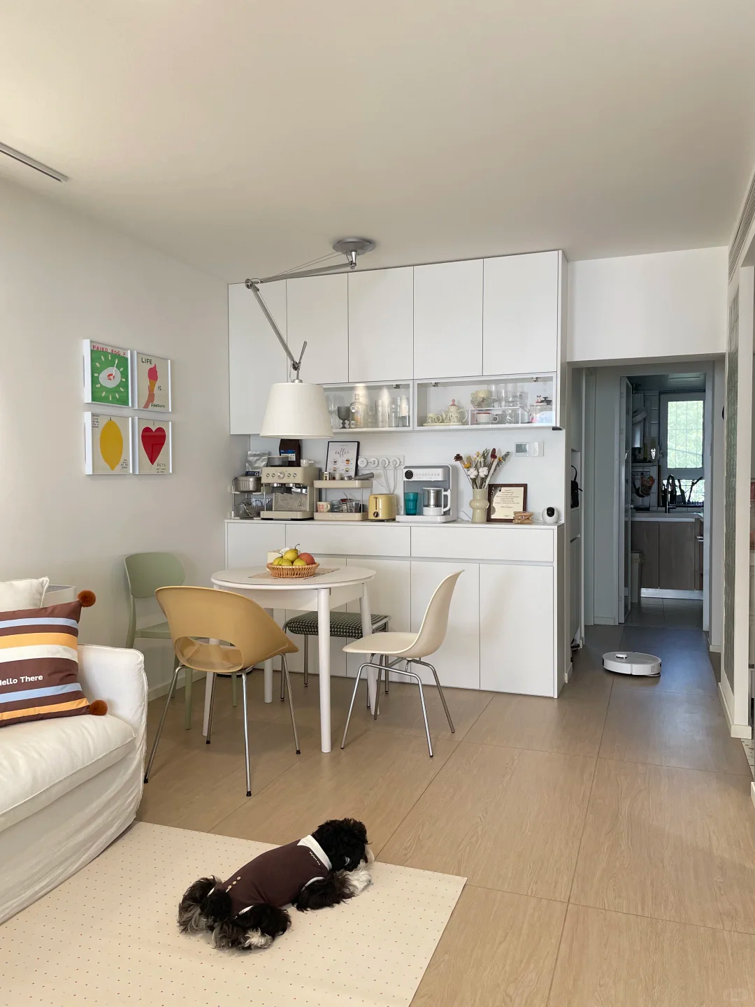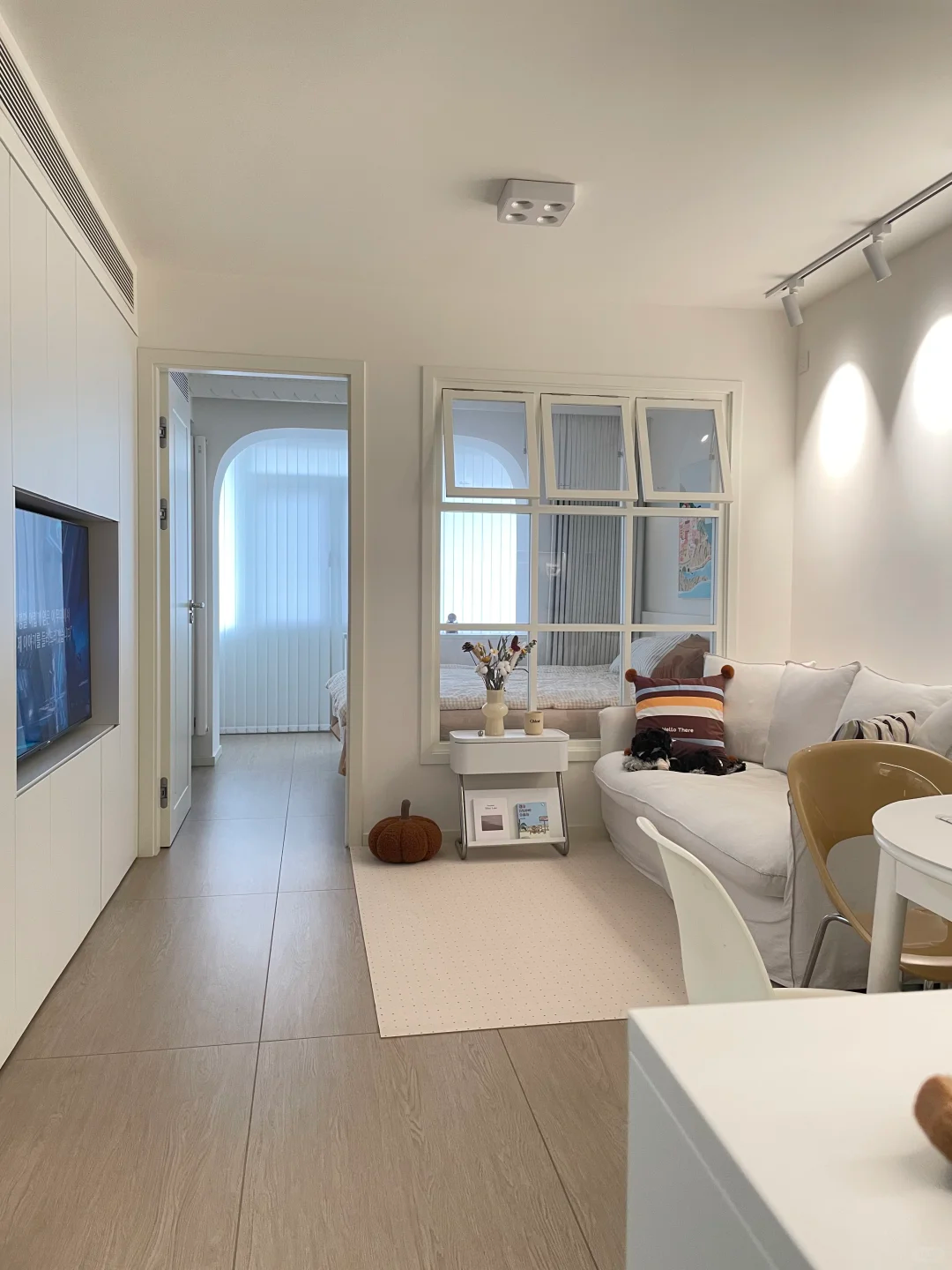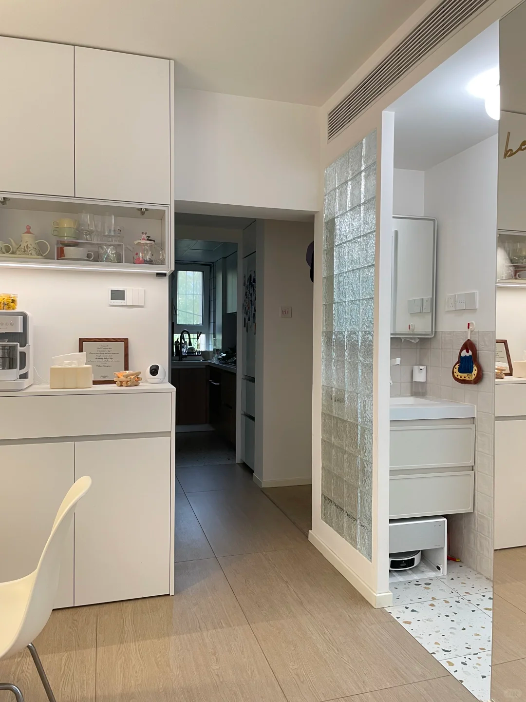 一进门,靠左侧墙直接安排了一组[color=rgb(0, 0, 0) !important]洞洞板—— 出门常背的包、随手脱的外套帽子,往挂钩上一挂就能归位,比普通挂钩灵活 N 倍。下方配了[color=rgb(0, 0, 0) !important]折叠换鞋凳,踩上去换鞋稳当,用完一推就能收进墙里,彻底把门口那点逼仄空间 “榨干”:既没乱糟糟的堆放,也没多余占地,刚进门就把 “小空间高效利用” 焊在了细节里。