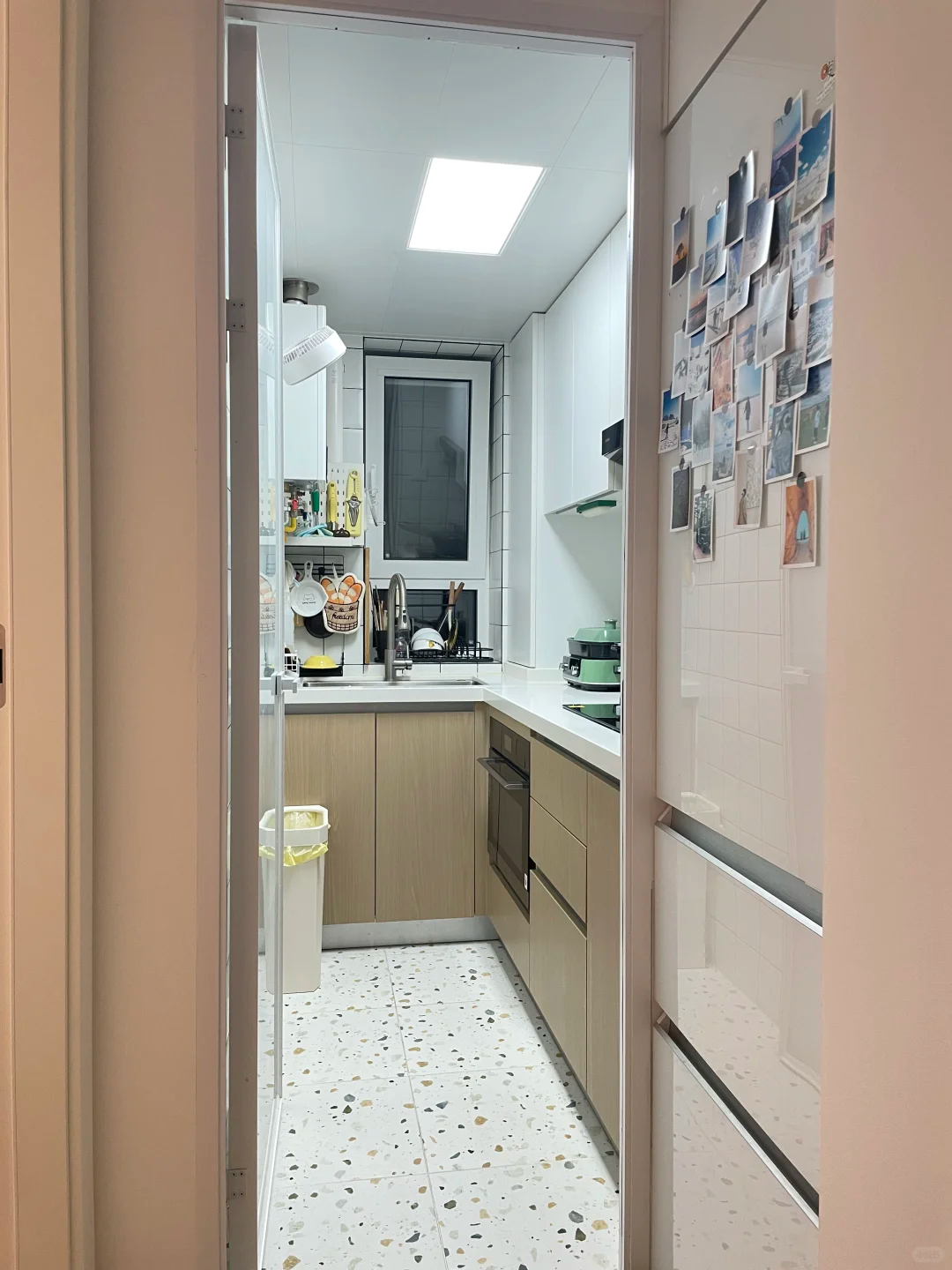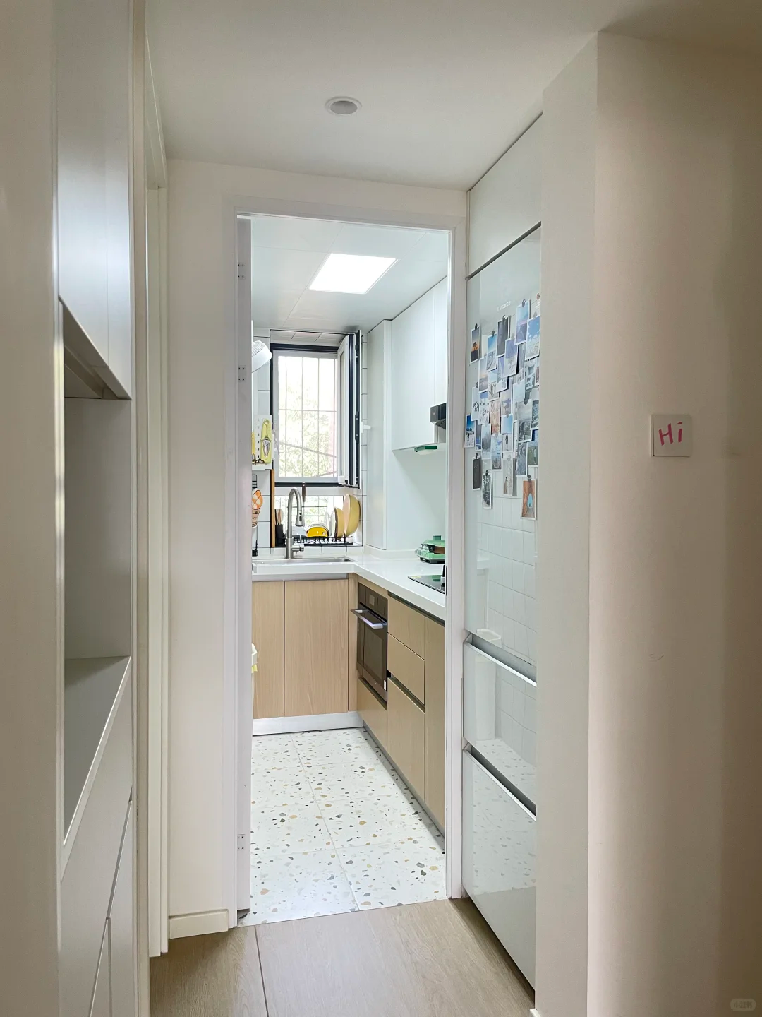 进门右侧就是[color=rgb(0, 0, 0) !important]厨房啦!原先的厨房门往里挪了挪,腾出来的空间刚好塞进一台[color=rgb(0, 0, 0) !important]嵌入式冰箱,一点没浪费。厨房面积确实不大,但动线超顺,洗切炒一站搞定,对于爱做饭的人来说,这样的小厨房完全够用,实用值直接拉满!