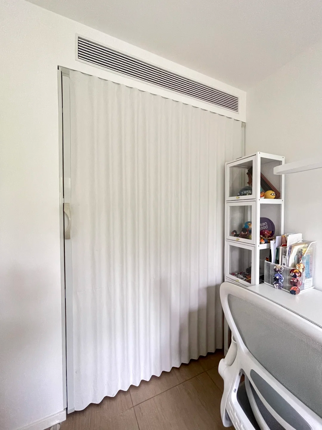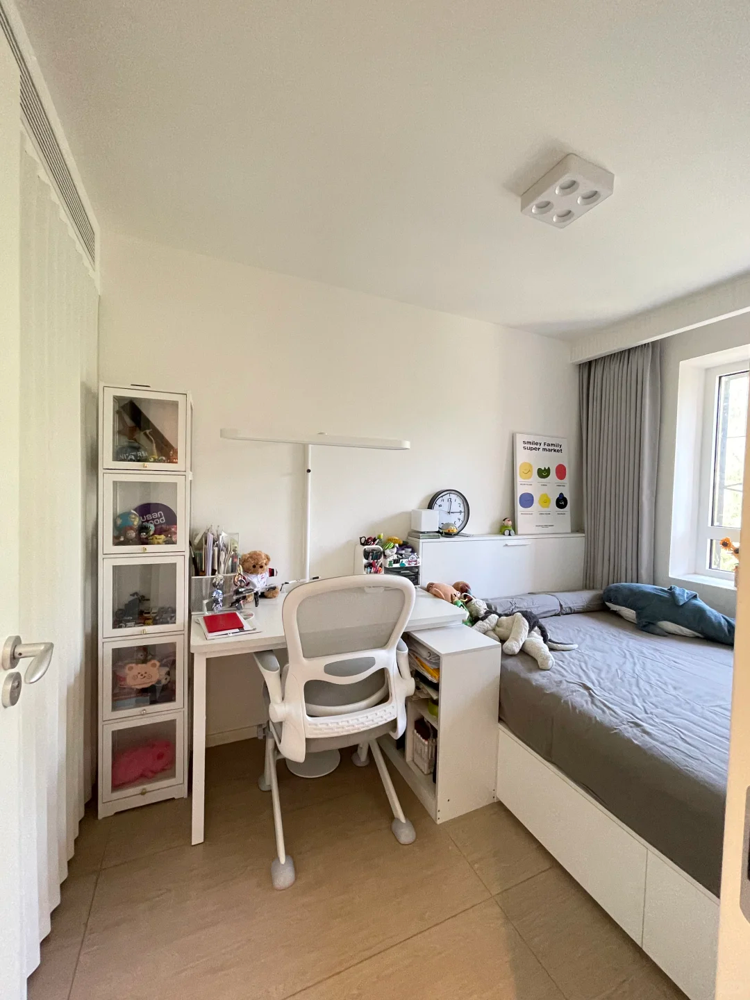 旁边摆着1.2m×70cm 的 L 型学习桌,再挤个35cm 宽展示柜放手办。全屋配日式推拉门省空间,内部搭金属衣架,行李箱和杂物都能塞,小户型空间利用率直接拉满!