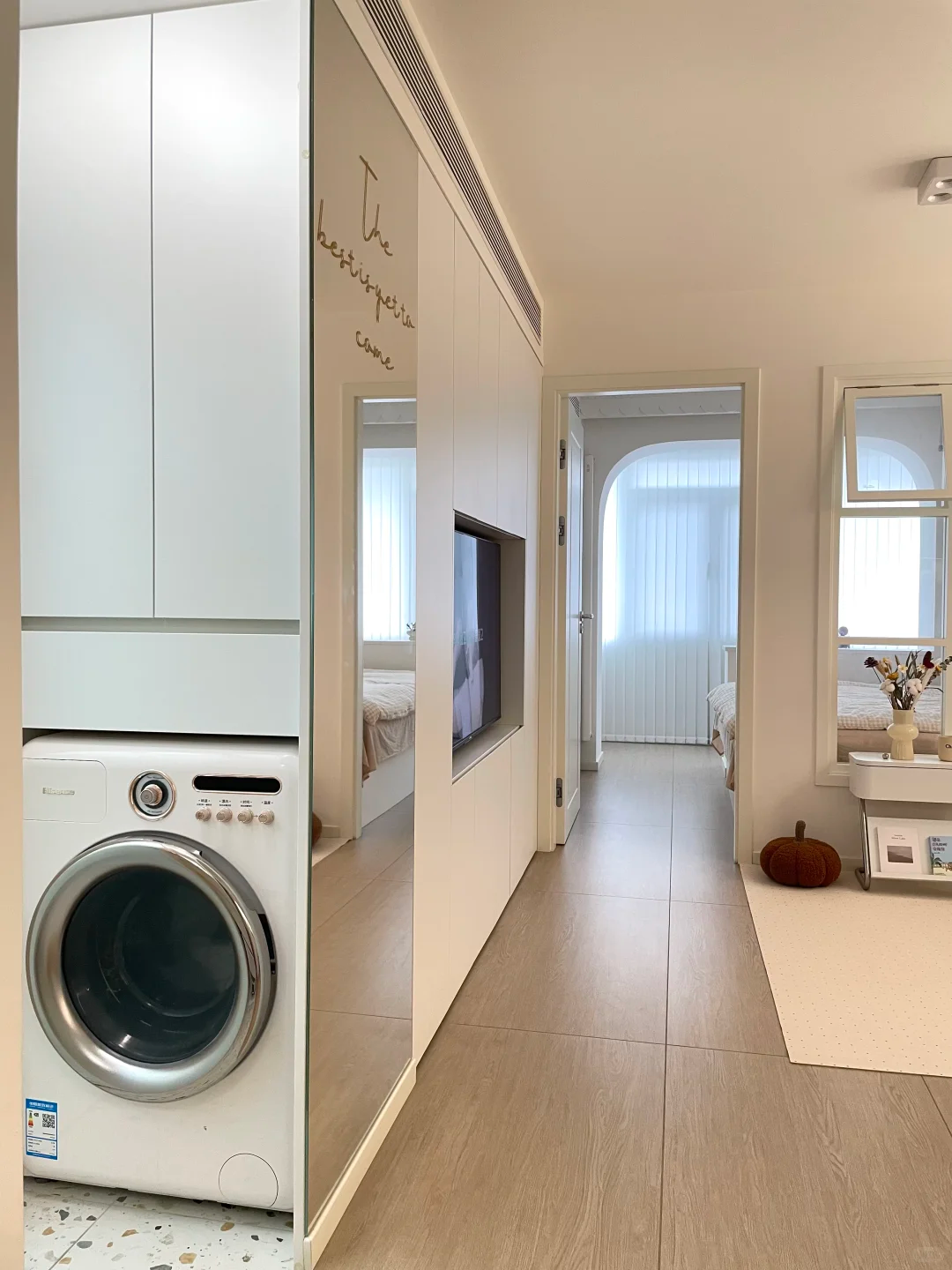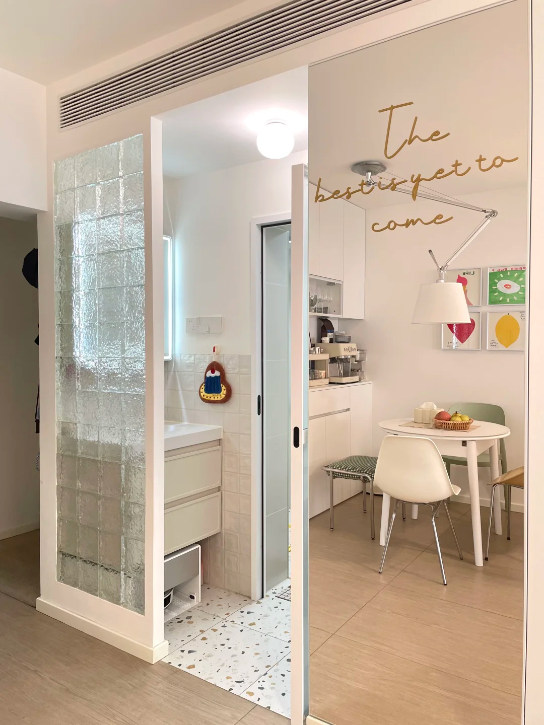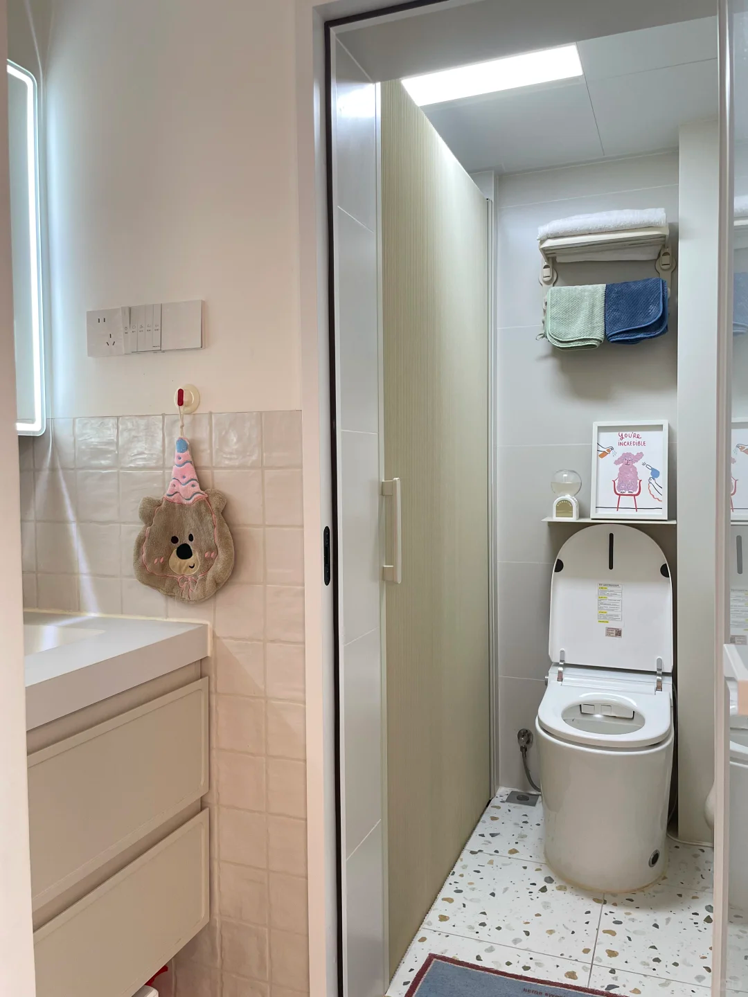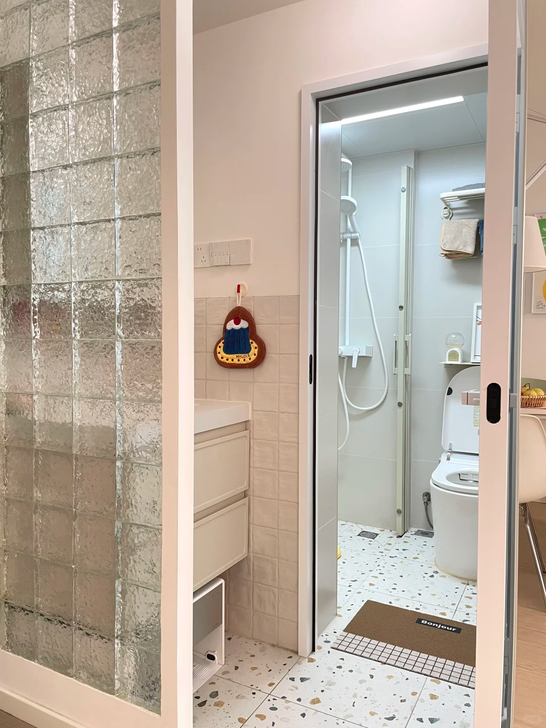 顺带还解决了洗衣机没地儿放的老痛点,把它安置进卫生间,彻底告别了之前阳台没上下水、推来推去的麻烦,改完简直太香了!